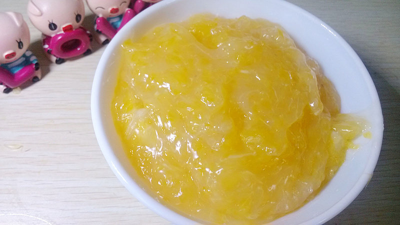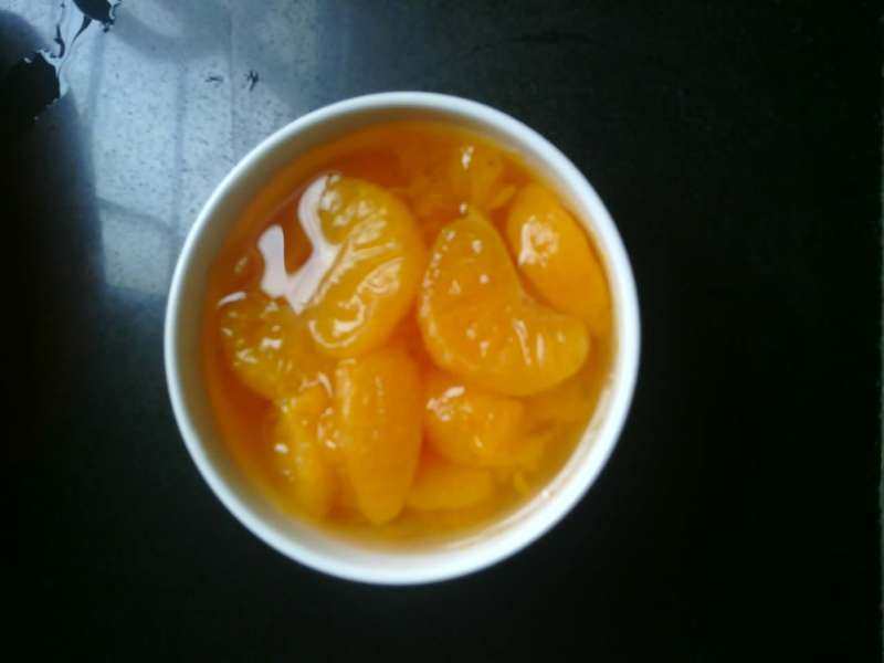 1:准备好橘子罐头。果肉和罐头里的糖水都要。用量可以根据您的需求来定。