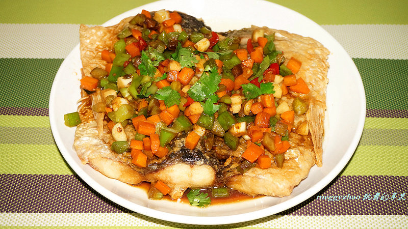 18:将菜丁和汤汁一并倒在鱼身上,就可以食用啦。