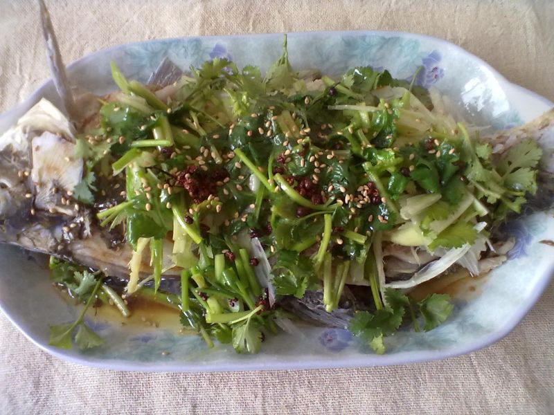 3:葱花,蒜蓉,干辣椒,放在鱼头上,冲油即可