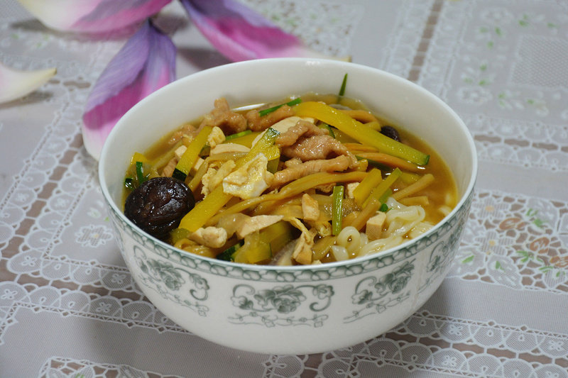 手擀面适量;瘦肉适量;鸡蛋适量;黄花菜适量;香菇适量;洋葱适量;嫩南瓜适量;豆腐适量;葱适量;