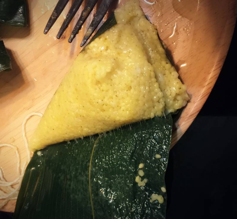 11:再用大黄米填满。用粽子叶将其包严、系紧即成。