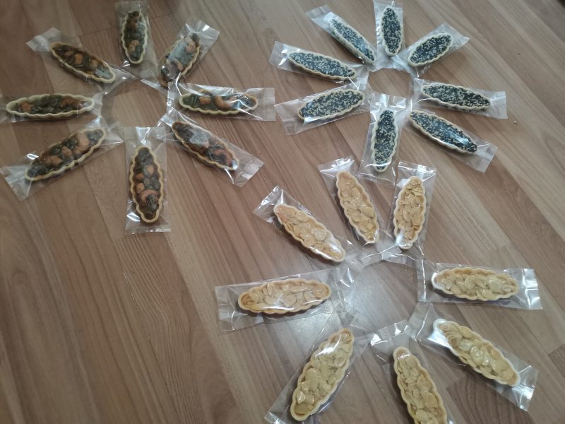 8:每个糯米船壳装入约7克的焦糖杏仁馅,不要装太多,多了烤的时候会溢出。