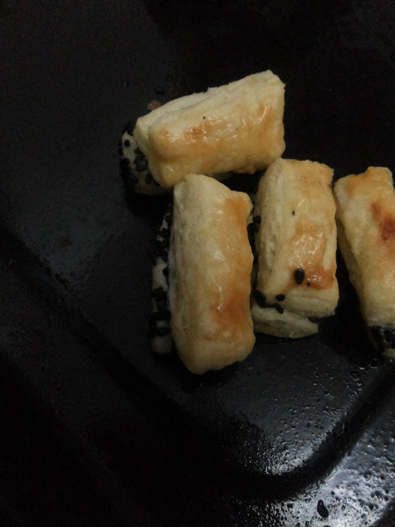 4:完了之后对折合起来,放到烤盘上,抹上蛋液,撒上芝麻,烤箱预热200度中层25--30分钟即可!