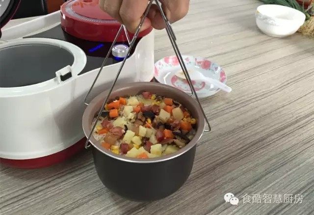 煮之前米要浸泡1小时,饭八成熟后在放配料