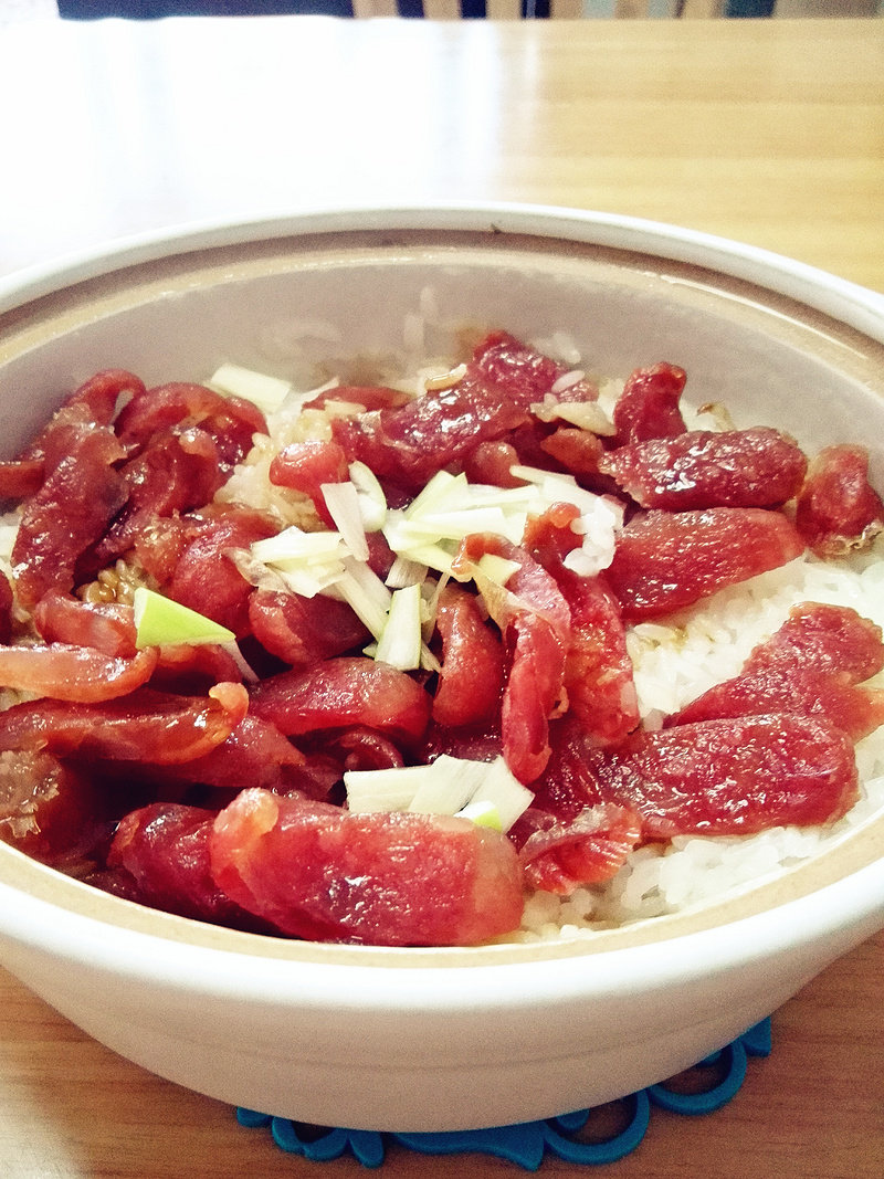 2:饭有八成熟后再把腊肠放入锅内