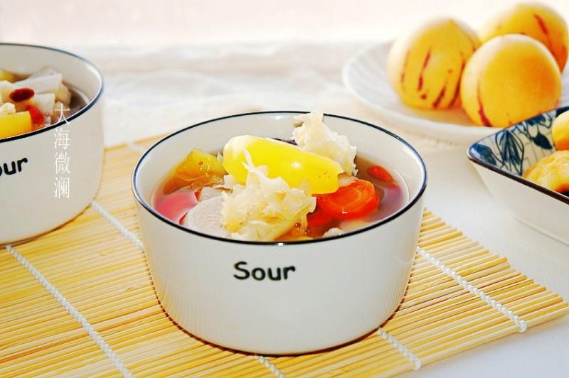 4:银耳煮得差不多的时候,下入胡萝卜、莲藕,大火继续煮至莲藕熟。