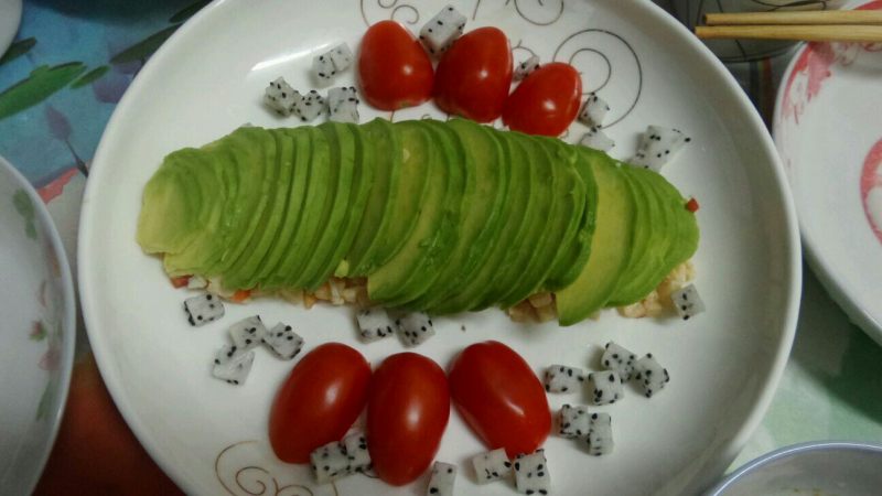 4:苹果虾沙拉均匀放到盘子上,呈一长条,然后沙拉上整齐码好牛油果。