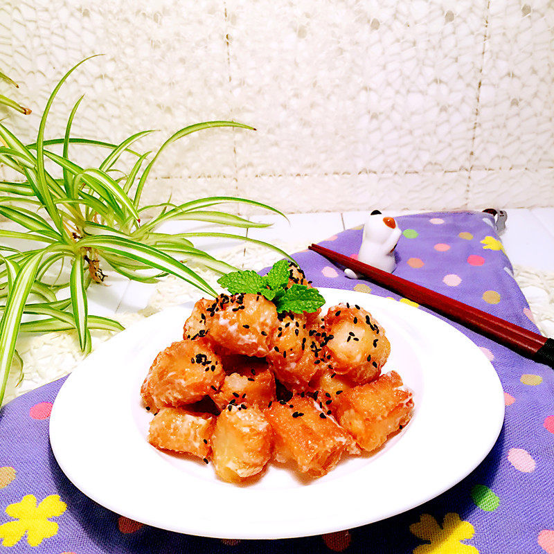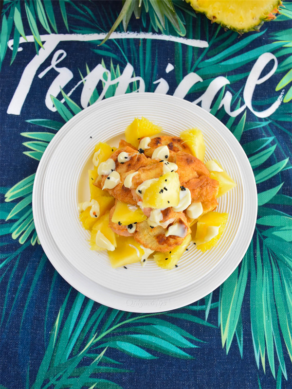 10:把煎好的油条沥干油后混合菠萝块加调好的沙拉酱拌匀即可。