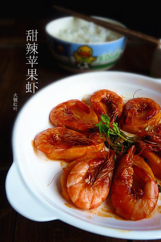 海虾适量;苹果1个;蒜片适量;色拉油适量;香菜适量;水适量;