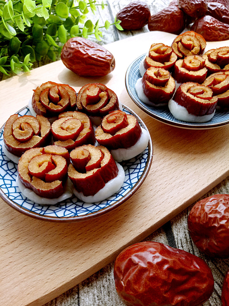 4:卷成玫瑰花的样子,我是用两个枣做一朵花,具体没什么固定的章法,想怎么卷就怎么卷。