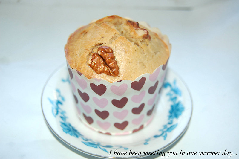 9:将面糊舀入纸模中,约七分满,在面糊表面放上适量的核桃碎。放入预热好的烤箱,上火150°C,下火130°C,烤25min即可。