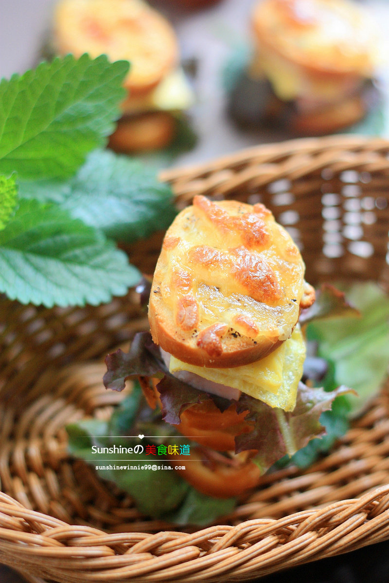 8:烤好的馒头撒上马苏,再次入烤箱烘焙。鸡蛋放一些盐摊成蛋皮,准备好生菜,将这些食材夹在馒头片中间就可以开吃啦。