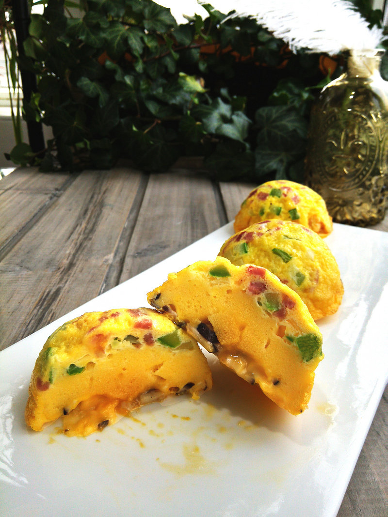 8:再把一个鸡蛋打散,加入撕碎的奶酪片和切碎的香菇,倒在模具中。香菇也可不加,根据个人口味和喜好吧。我用的早餐切达奶酪,如果用马苏里拉奶酪,会有拉丝效果。