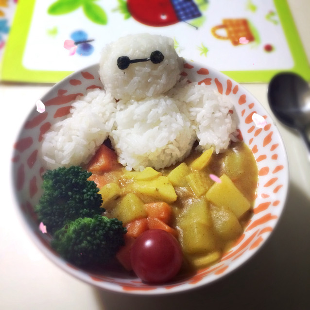 8:煮好的米饭捏成饭团眼睛用紫菜剪好用西兰花小西红柿摆盘