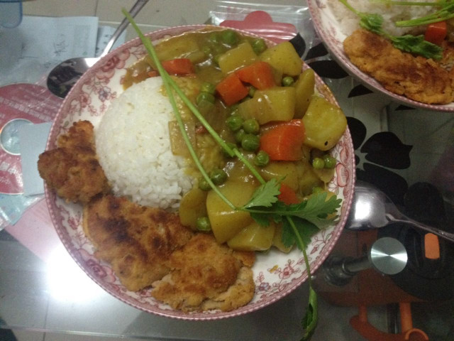 4:装盘:米饭,猪排,咖喱覆盖,放上香菜点缀。