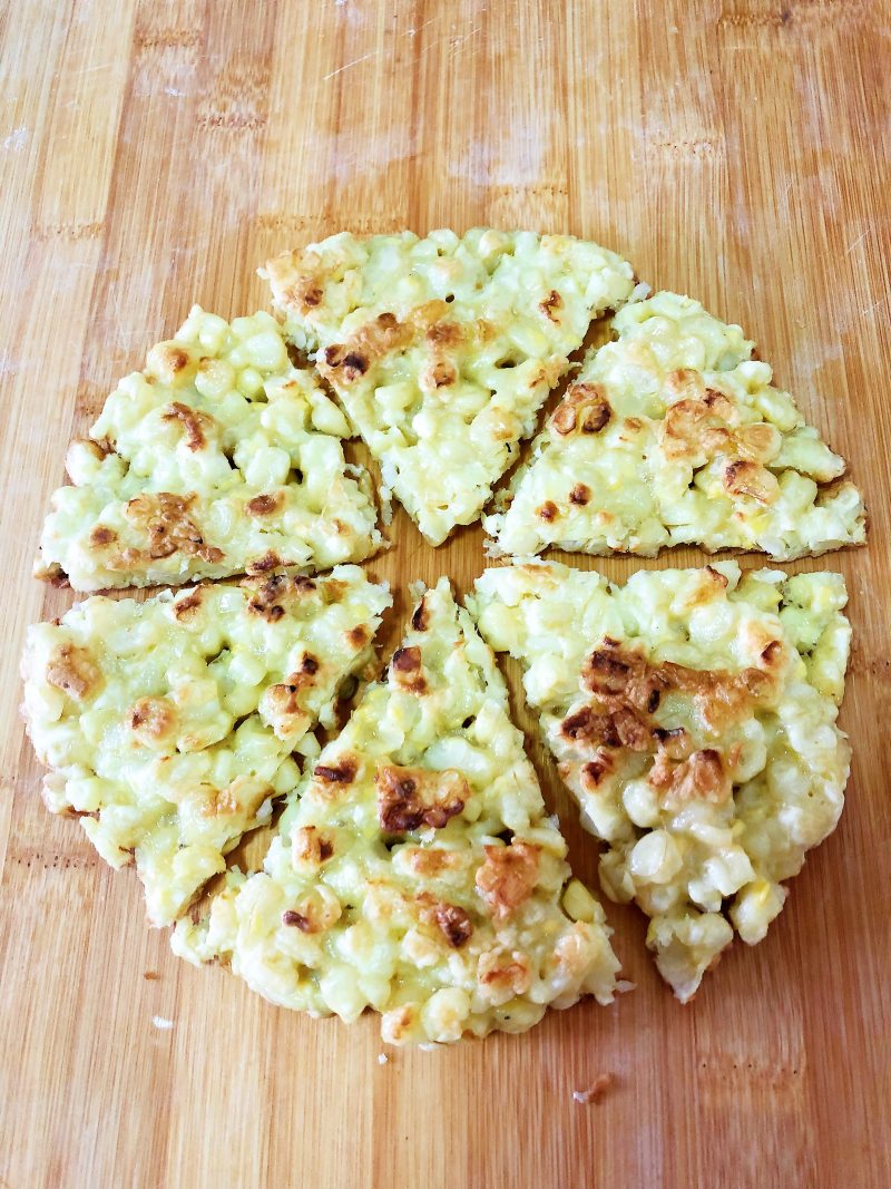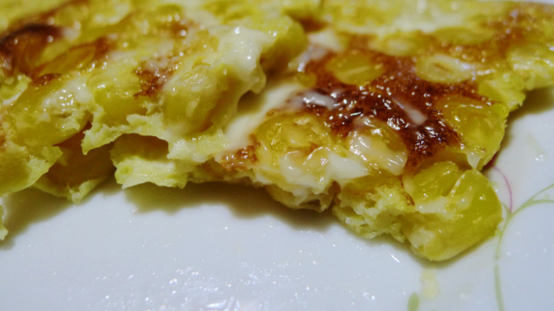 4:平底锅,烧热,放油。放入玉米粒。摊平。小火慢煎。稍微多煎一会,定型后煎好一面,翻面。
