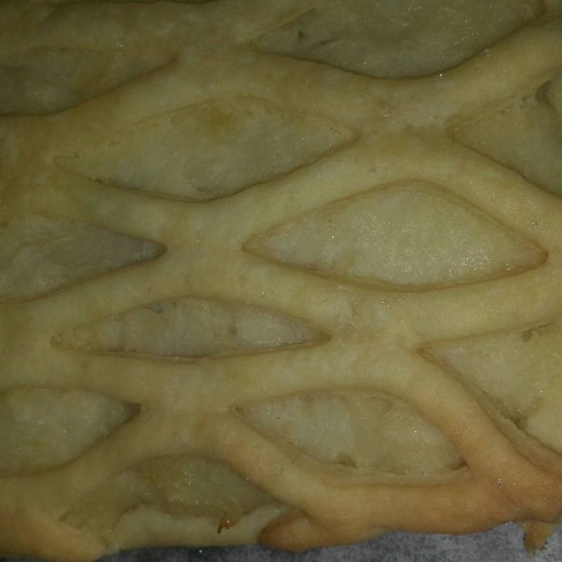 15:没有模具的也可以在烤盘里铺上锡纸,将面皮切出一片长方形,四边刷上全蛋液,长条按如图所示粘在长方形面片上.