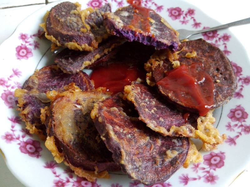 9:炸好的紫薯饼配上番茄酱