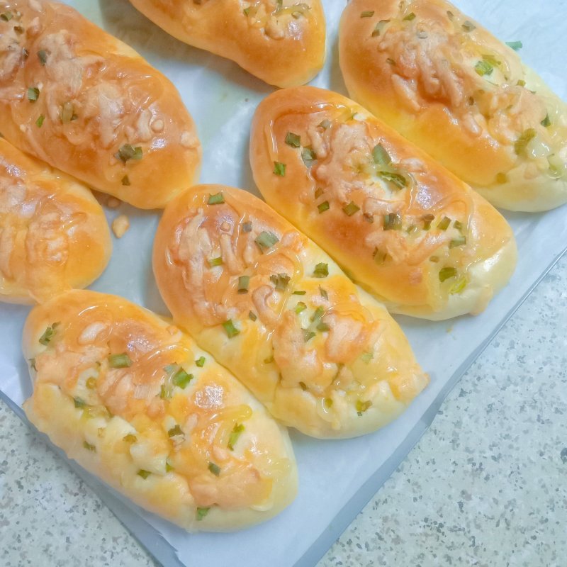 9:发酵好后,在面团上刷一层鸡蛋液,挤上沙拉酱,然后撒上葱花和芝士。