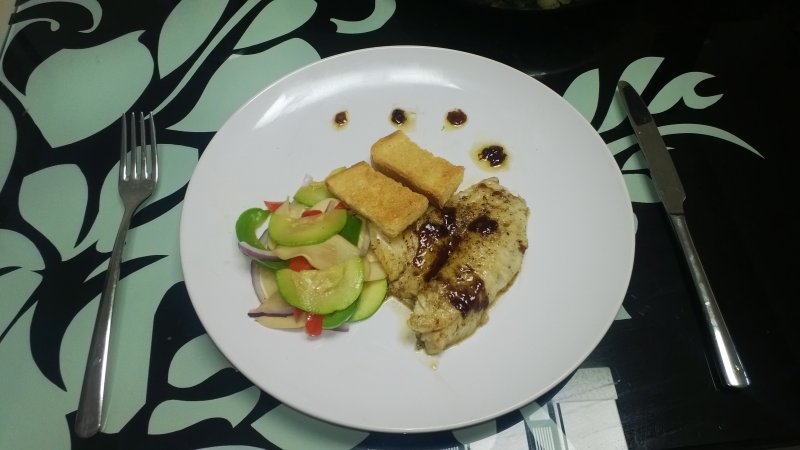 7:黑醋汁调的那一步忘记拍了,装盘就随便发挥咯,加上两片烤面包。美味一餐就搞定咯。