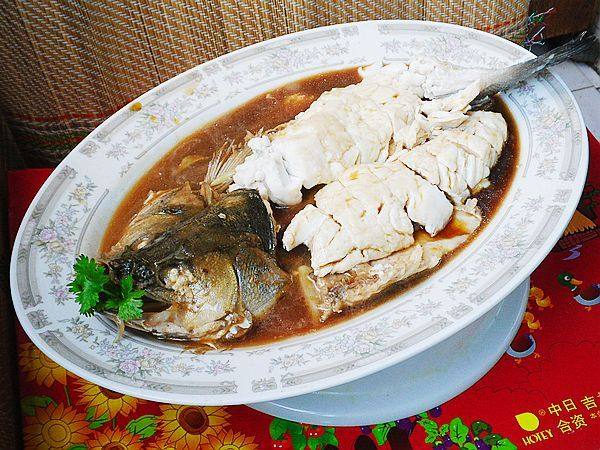 4:将鱼重新下锅,倒入料酒,盐,糖和500克热水;改小火烧6-8分钟,然后将余料放入,大火烧熟;将鱼盛出;大火将汁收稠,出锅前点几滴香醋。