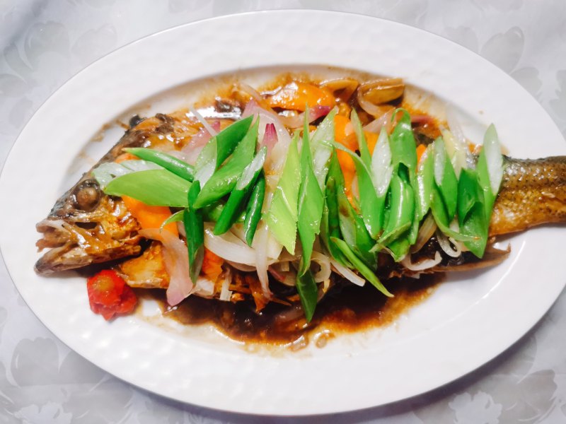 4:盛入盘中,胡萝卜、洋葱、葱叶铺鱼身,另起锅油烧热淋上即可。