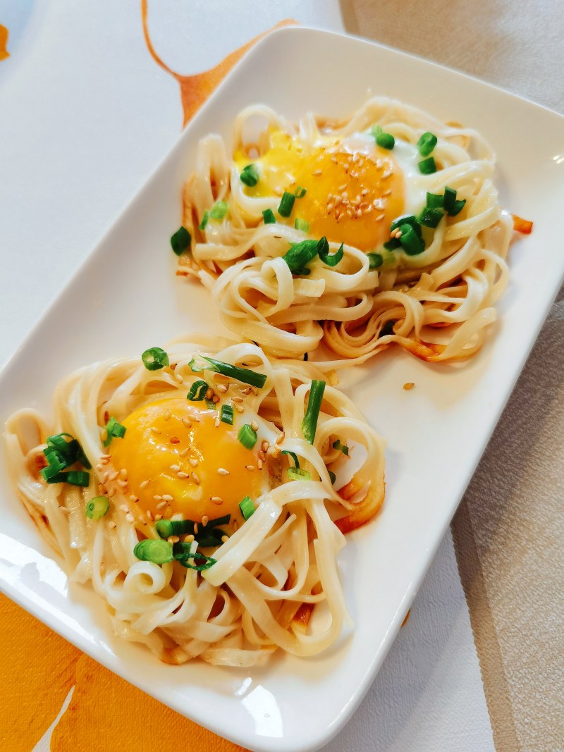 3:用煮熟的面条围成一个圆圈,中间倒入蛋黄,蛋黄上撒上少许盐,小火煎熟即可,出锅撒上一点葱末。