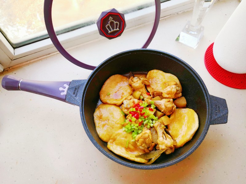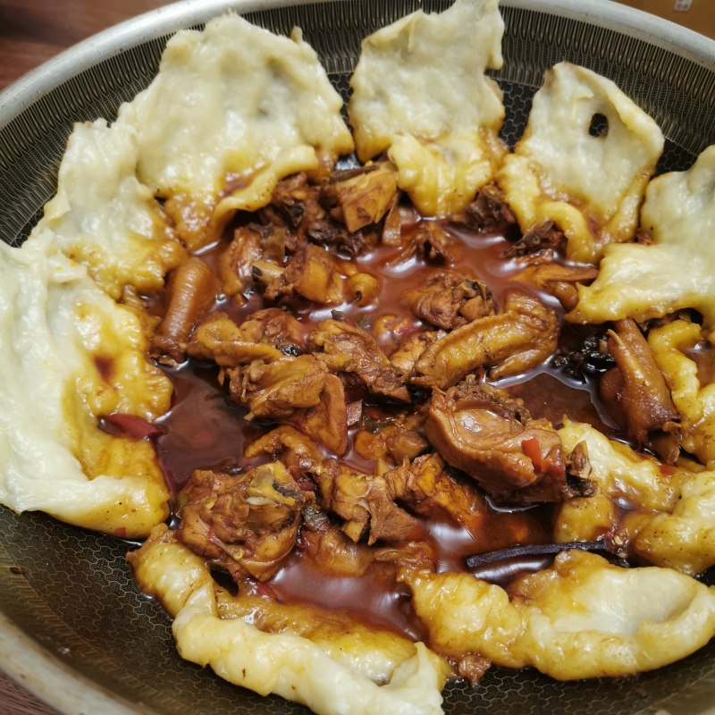 3:将面粉用温水揉成面团,擀成薄片,待鸡肉熟透后贴放于锅围盖上锅盖煮十分钟即可。