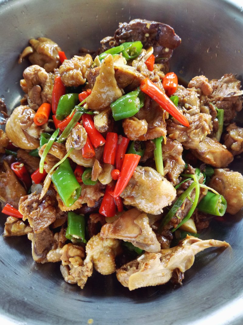 7:炖好的鸡块大火收汁放红辣椒蒜末拌匀出锅加入适量葱花