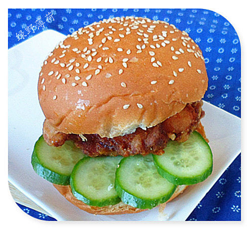 9:将鸡腿和荷兰乳瓜夹在汉堡坯上,挤上丘比沙拉酱即可。