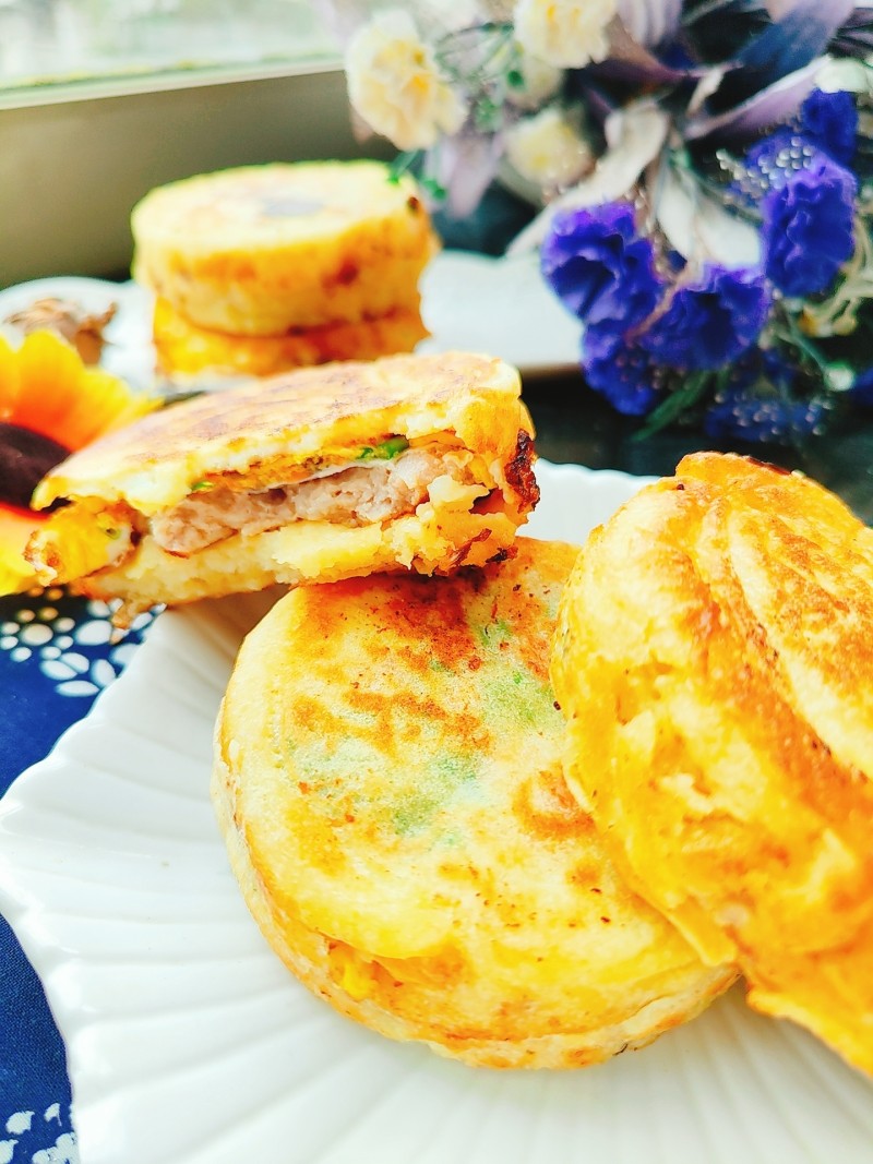 面粉100g;水160g;泡打粉少许0.4左右;鸡蛋三个;肉末适量;