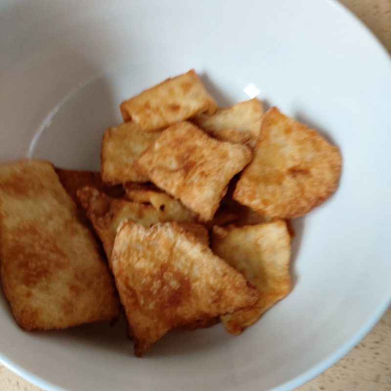 8:小火或者中火大概四分钟,锅巴两面金黄捞出。整个面片可以分三次炸完。