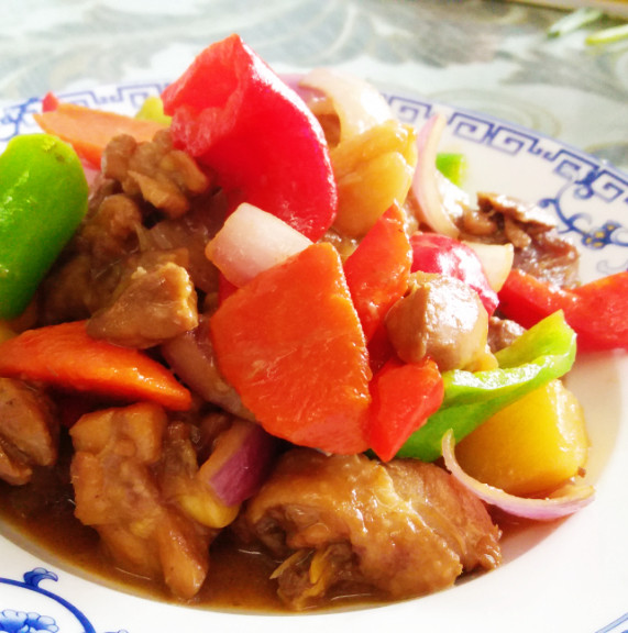 7:剩少许汤汁时加入洋葱,青红椒快速翻炒,加少许盐,鸡粉调味即可