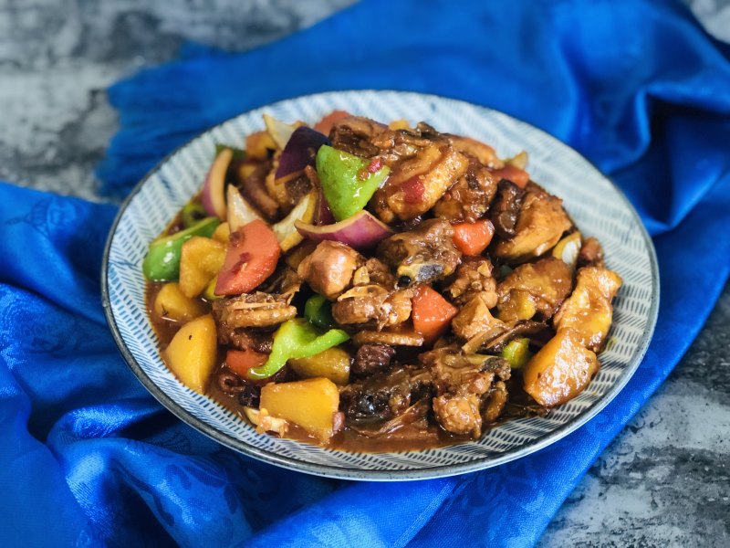 仔鸡300g;土豆1个;洋葱半个;胡萝卜半个;红椒1个;青椒1个;