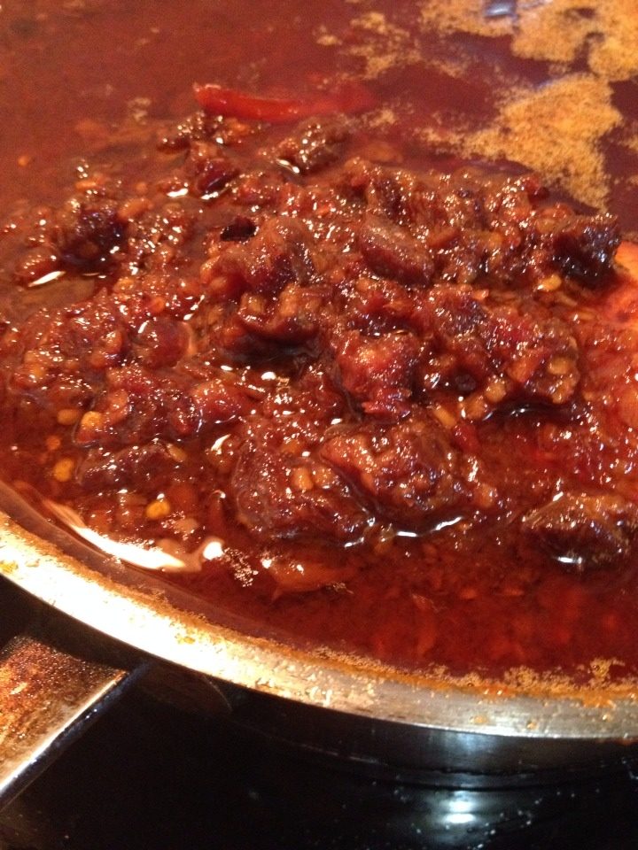 12:放入辣椒蒜泥继续熬,不停的炒,起码一个半小时