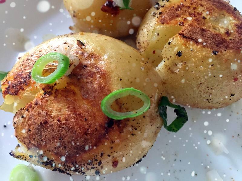 4:煮熟的土豆捞出控干水分,土豆皮不用剥掉,煎出来口感很棒的。锅内油热,放入小土豆,用铲子轻轻压扁,注意不要压碎哦。撒盐、辣椒面、黑胡椒粉、孜然粉,翻过来煎另一面,同样撒调料,两面金黄即可。