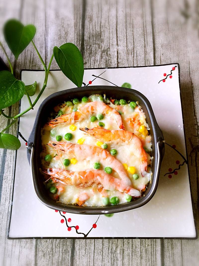 2:炒好的二米饭加上撒上奶酪,放上大虾。