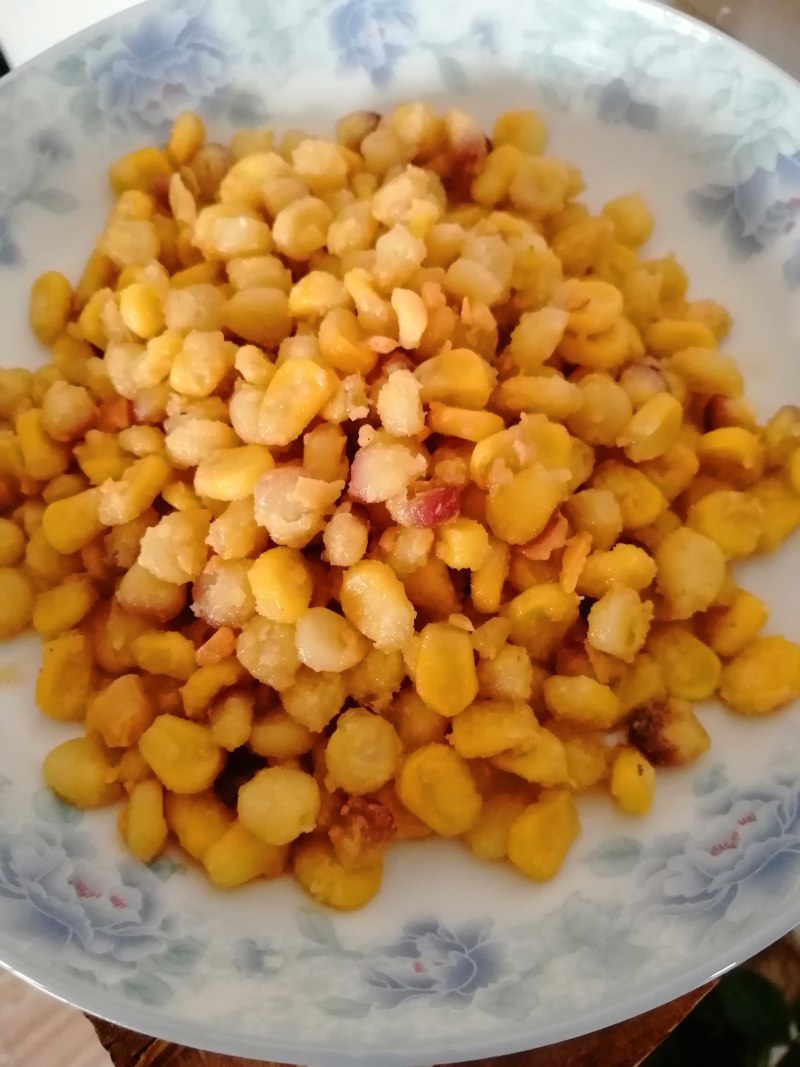 2:玉米下油锅中火炸至脆黄厨房纸吸干浮油留少许油,倒入调好的蛋黄液,炒至起泡
