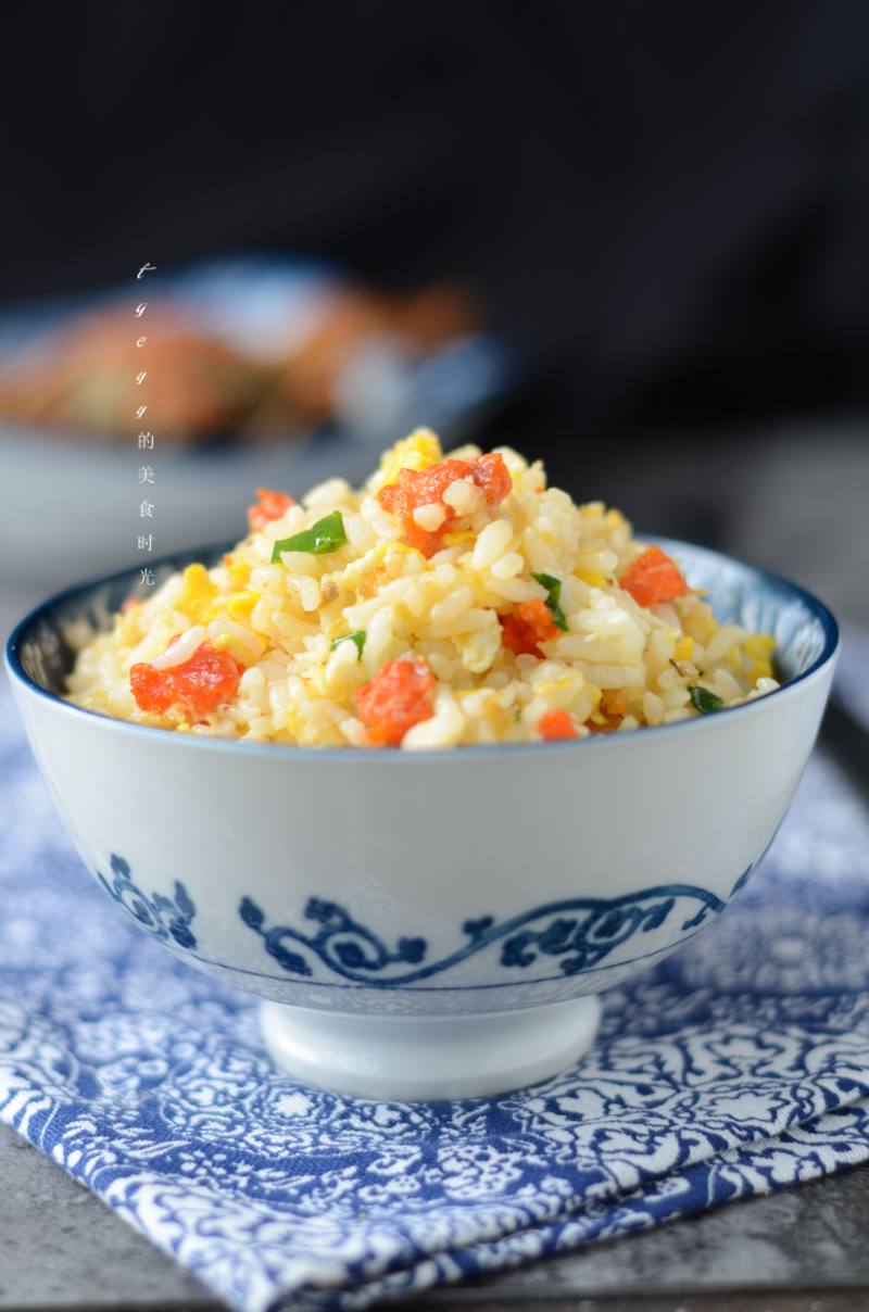 1:饭干水时放入蟹籽在饭的表面摊开。