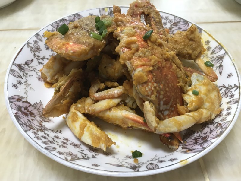 1:梭子蟹掀开壳,中间切开,去腮洗净备用,咸鸭蛋去蛋白蛋黄留用。