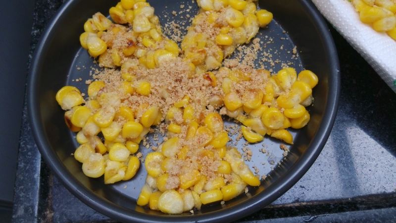 4:洒上玉米淀粉,这里要注意的是一定要让每一粒玉米都沾上淀粉。