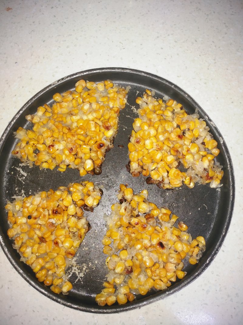 2:锅内座少许底油,将玉米粒下锅后哟个铲子压平收紧