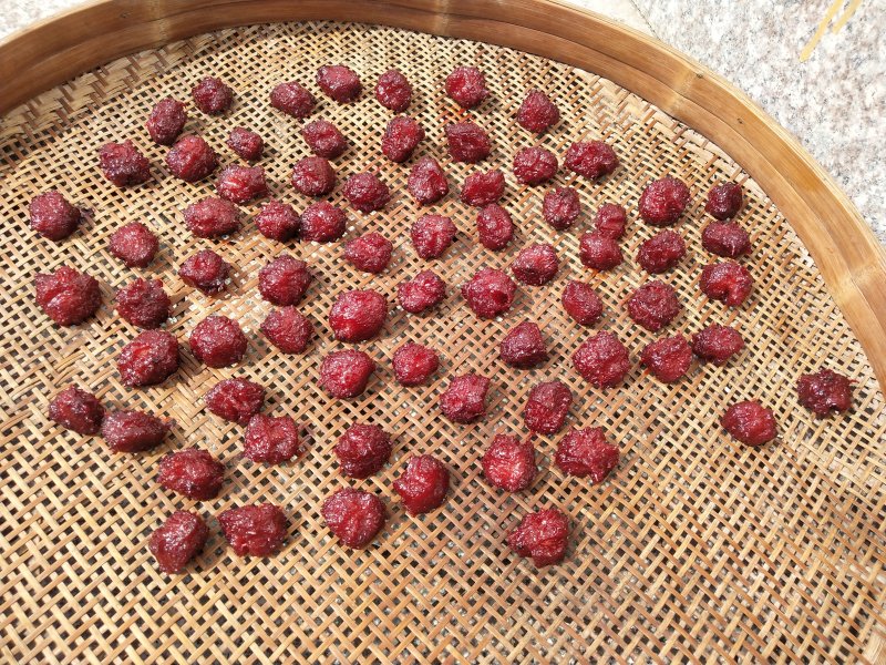 6:把收汁的杨梅铺在竹簸箕上,大太阳底下晒一天。也可以放微波炉叮10-15分钟,或者烤箱上下火150度30分钟,晒干的口感会更好。
