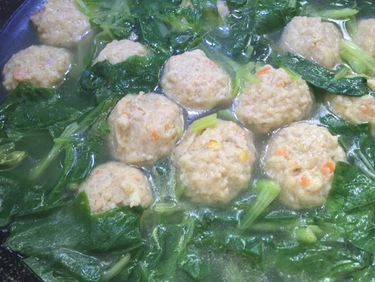 3:将葱花炸香加入青菜水烧开加入之前的丸子烧开即可!