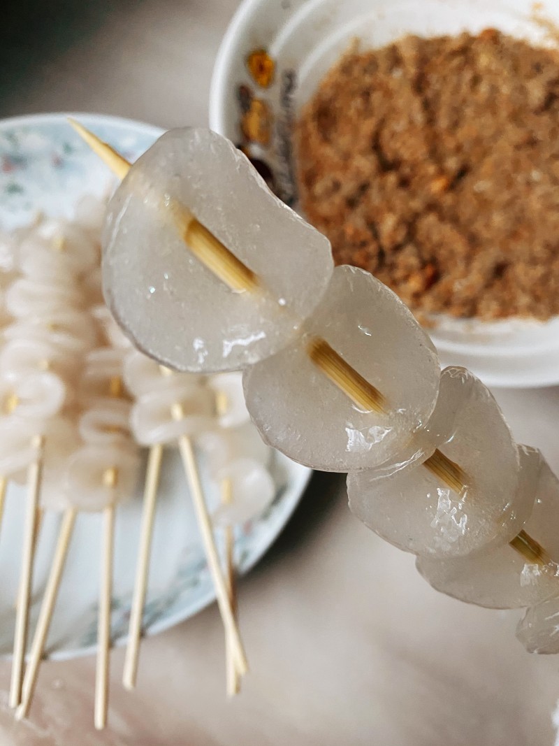 4:那出签子,把泡在水里的QQ串,串起来,就可以食用啦。