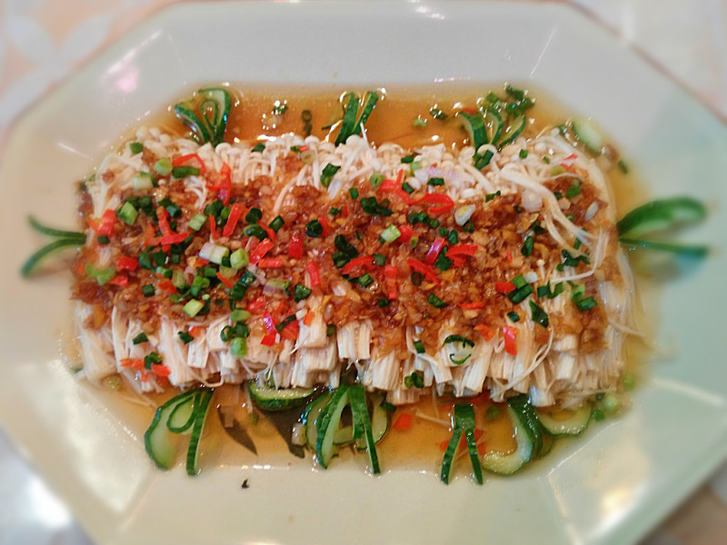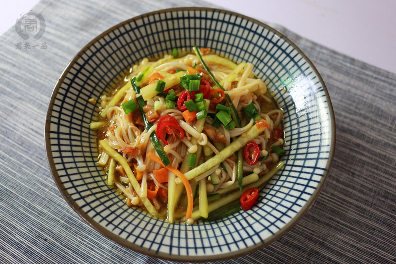 1:食材准备:主料:金针菇、黄瓜丝辅料:芝麻油、自制凉拌酱、朝天椒、蒜末、陈醋、花椒粉金针菇清洗后焯水,备用。