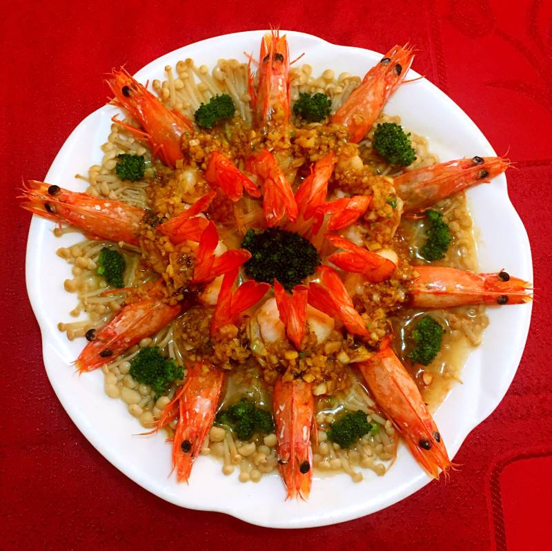 14:炒入味的蒜蓉用勺子浇在虾肉上并且摆上西兰花做装饰