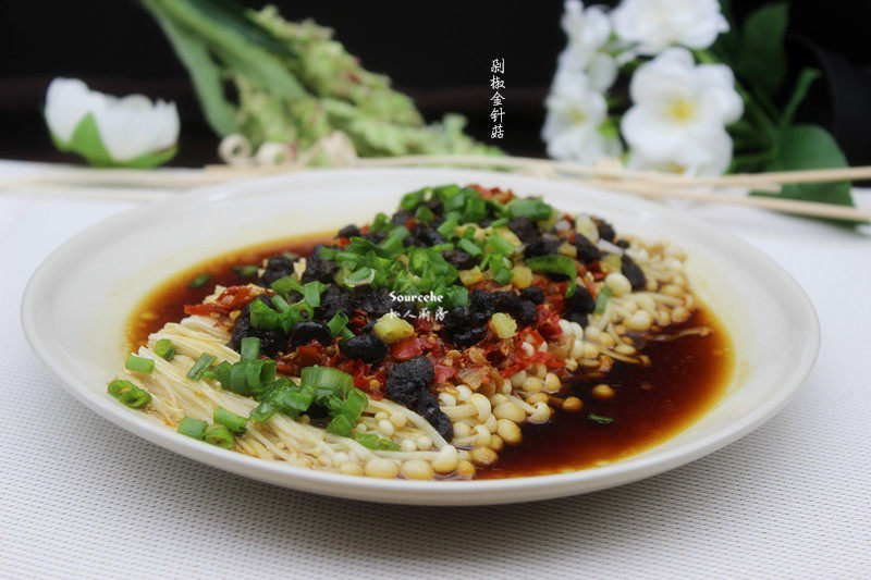 4:将酱汁铺在金针菇上面,撒上葱花与切碎的辣椒