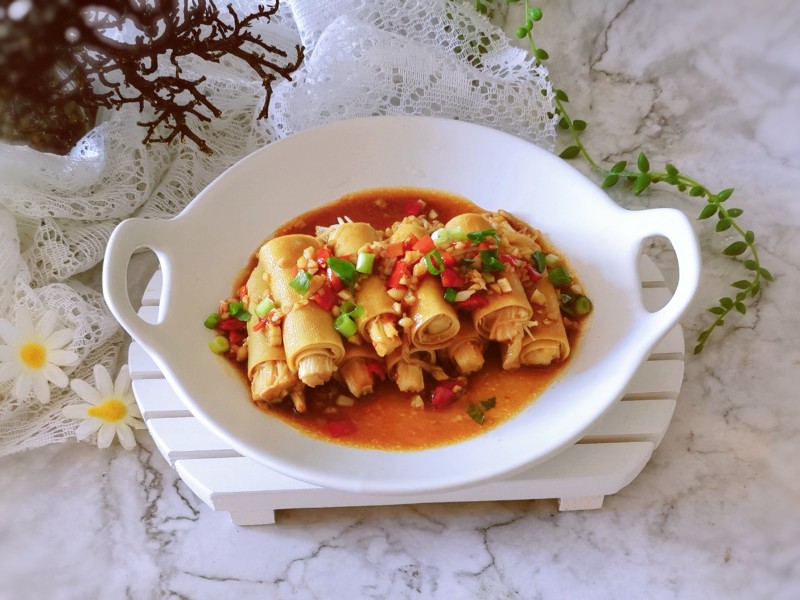 豆皮卷尽量卷紧实,油煎时不容易松散。