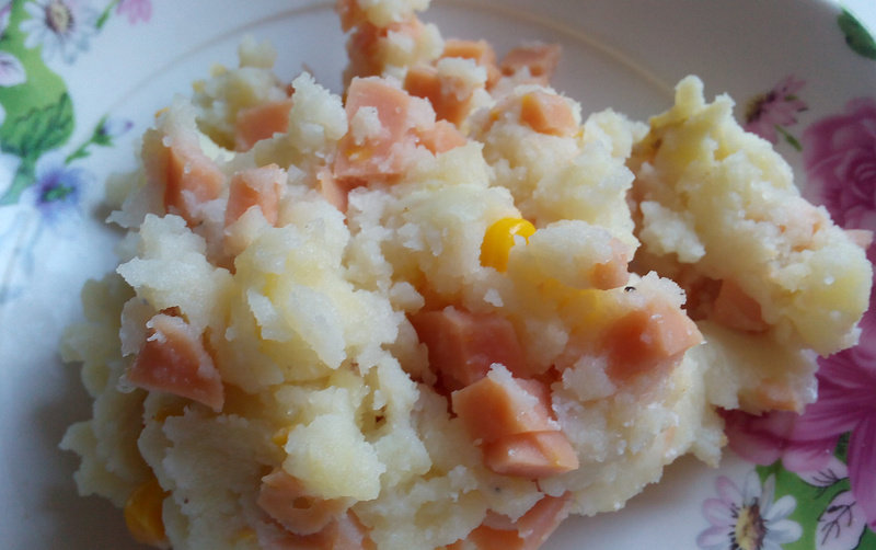5:然后土豆泥中加入火腿肠和胡萝卜,再加适量盐,胡椒粉,花椒粉,和土豆泥一半量的面粉。拌匀。
